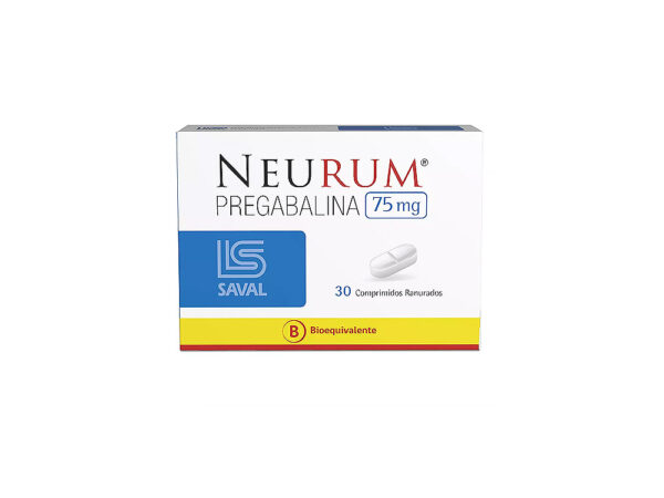 El envase contiene 30 comprimidos de Neurum, cada uno con 75 mg de pregabalina.